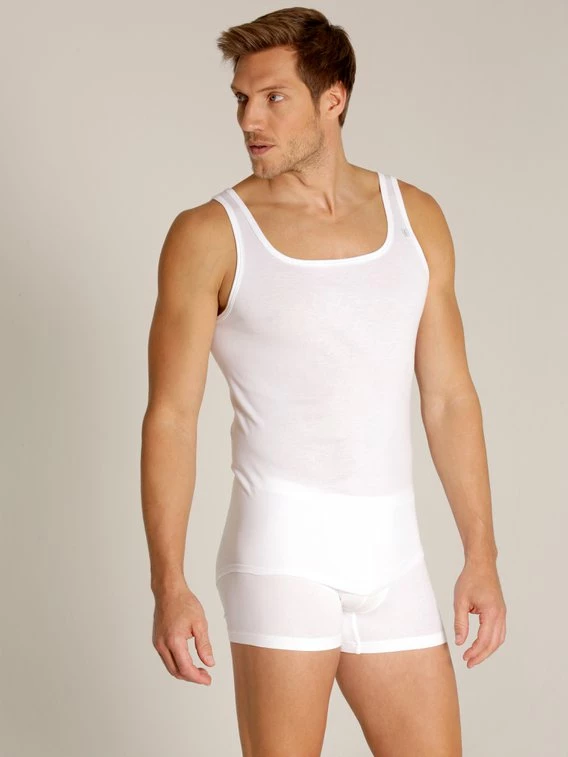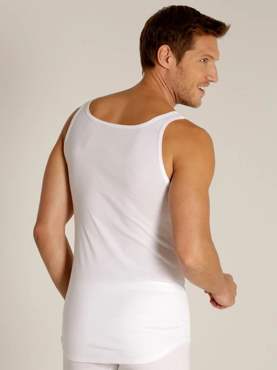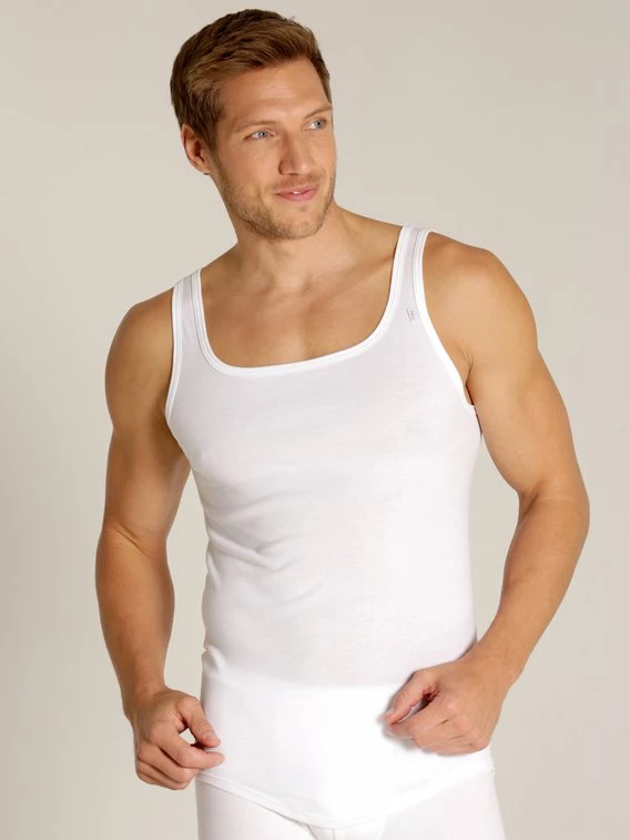Klassisches Achselshirt mit körpergerechtem Funktionsschnitt und dauerelastischen Arm- und Beinabschlüssen. 100% feinste Pima-Baumwolle wurde zu einem Feinripp 1:1 in feinster Teilung verarbeitet.